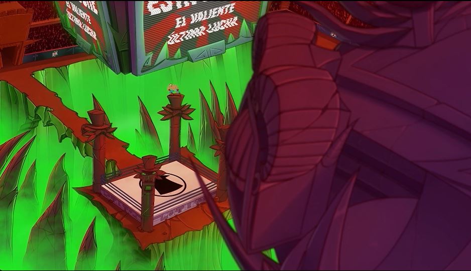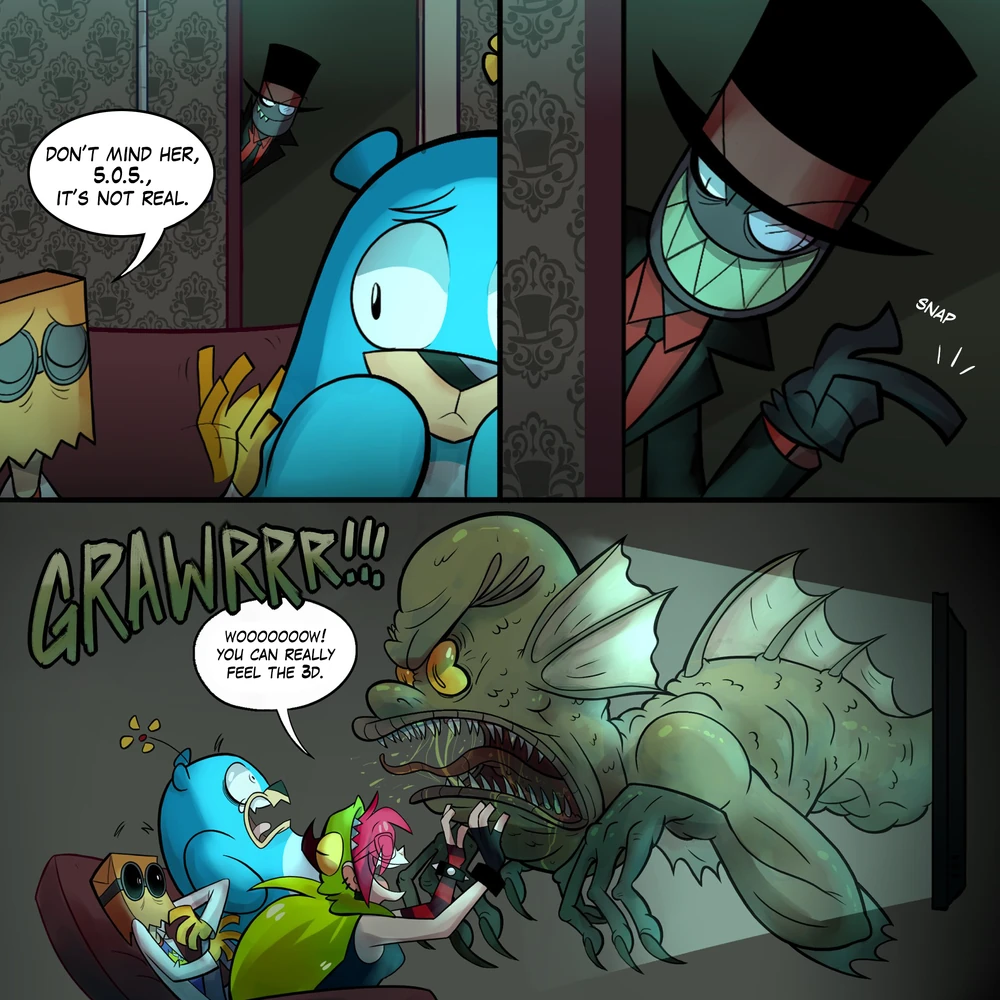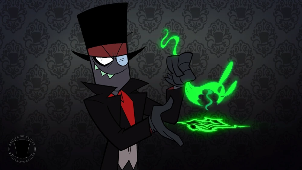 Alastor’s head sprouts antlers before emitting a large, green explosion. Black Hat had teleported away onto one of the dimension’s many floating platforms. Aside from being charred–and annoyed–he was fine.