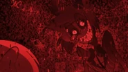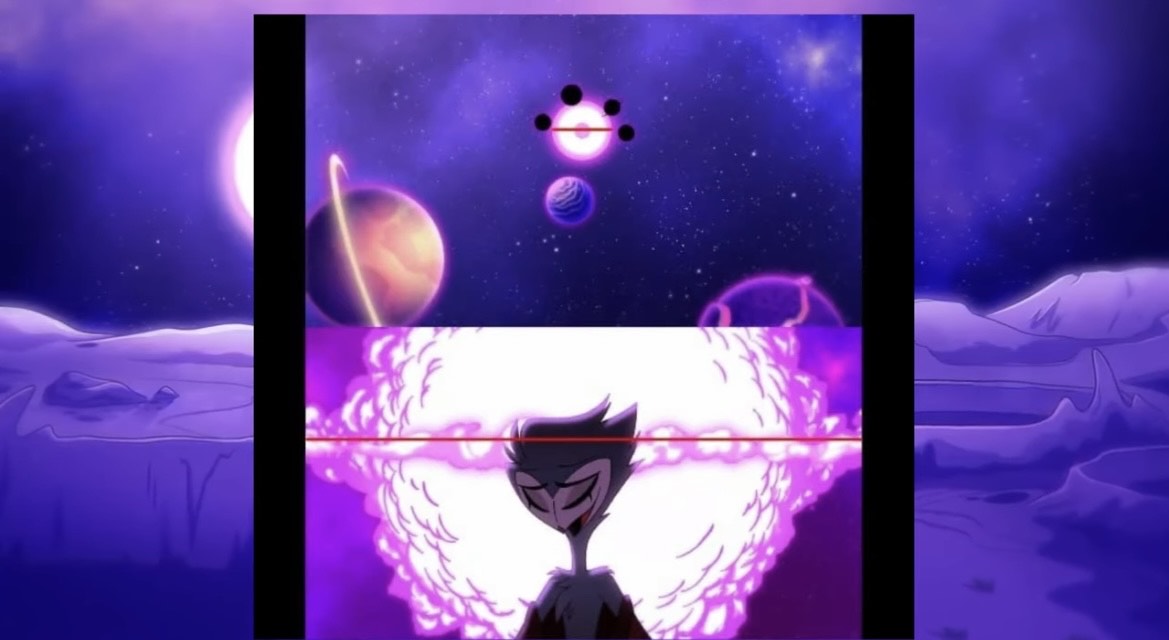 Alastor turns into shadow and sinks into the ground, but not before summoning a ball of fire that floats upward. A gigantic Black Hat emerges from the barrier’s surface. He cackles maniacally as he points up to the sky towards Hell’s moon/pentagram sphere. The sphere shoots a laser down on Alastor’s barrier. In the grass, the eyes of Alastor’s shadow widen in surprise.