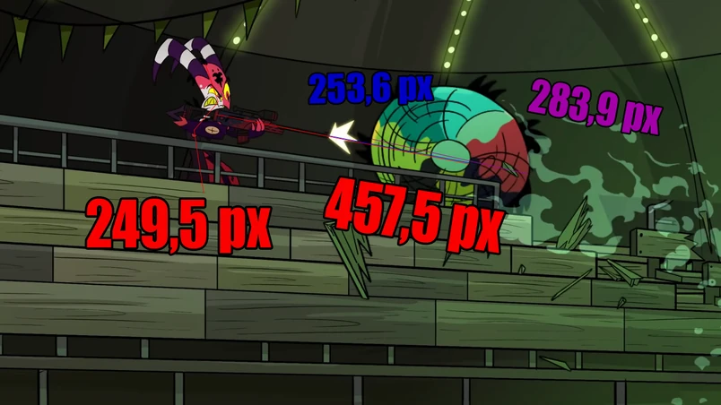 Alastor jumps off the platform, attempting to jump onto the next. But the platform tilts and smacks Alastor, knocking him into another platform. He expands his shadow into a force field. So now, Alastor was bouncing off of multiple platforms like a ball in a pinball machine. It is revealed that Alastor actually *is* inside a pinball machine being played by Black Hat.