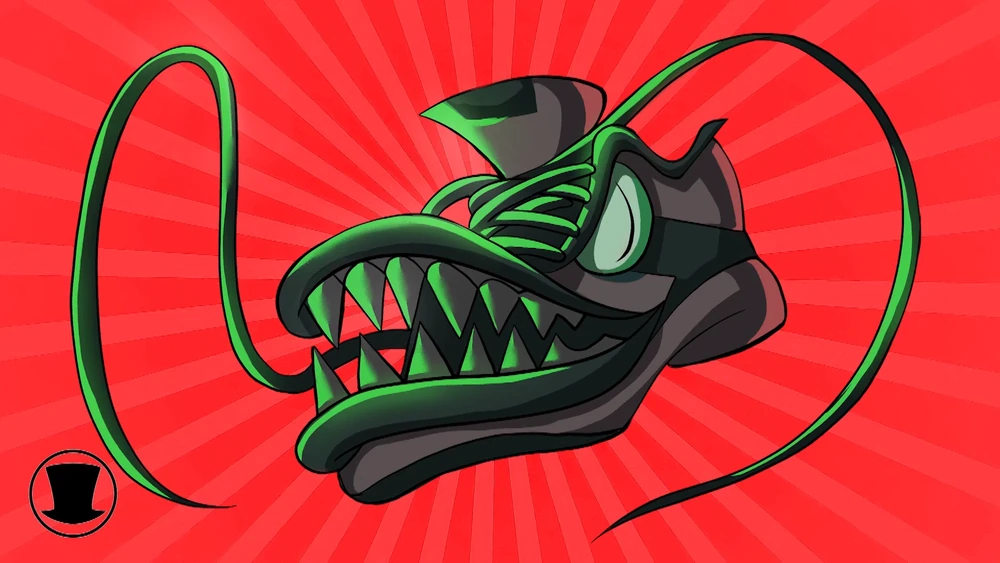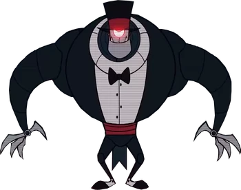 Alastor’s static screams of agony emit from his cane. Black Hat laughs all the while. Alastor’s process of being crushed into a tiny ball is canceled as he removes his own head from his shoulders using his tentacles. Black Hat hisses in repulsion. Alastor’s head runs away using the tentacles that sprout from his neck. He hops towards his cane and catches it with his teeth, only for him to be teleported into Black Hat’s hand.