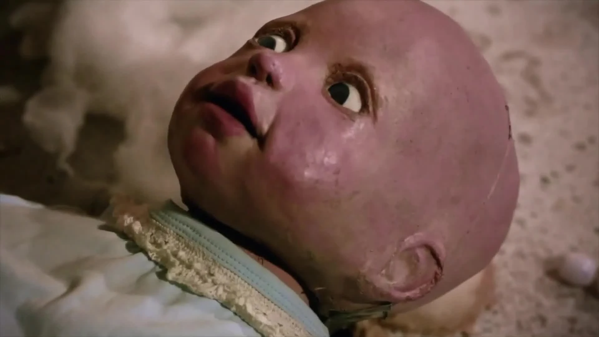 Baby Oopsie Daisy (Also referred to as Baby Whoopsie in Demonic Toys 2: Personal Demons) is the foul-mouthed baby doll from the Demonic Toys Franchise. She is typically seen in a blue dress with white floral patterns on it. She also tends to not have any hair. She has been seen with many eye colors ranging from green, to yellow, to red, to blue.