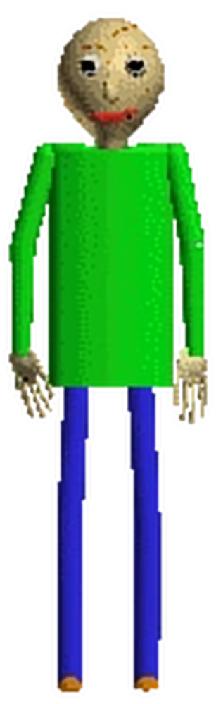 Baldi is a poorly CGI (computer-generated imagery) modeled humanoid figure with long, skinny fingers, a pale body, large red lips and is bald except for what seems to be a singular hair on his head. He also has a long-sleeved green shirt, blue pants, and light brown shoes. Strangely enough, Baldi's facial expression while chasing the player, while heavily compressed and distorted, is incredibly neutral and not one of anger.