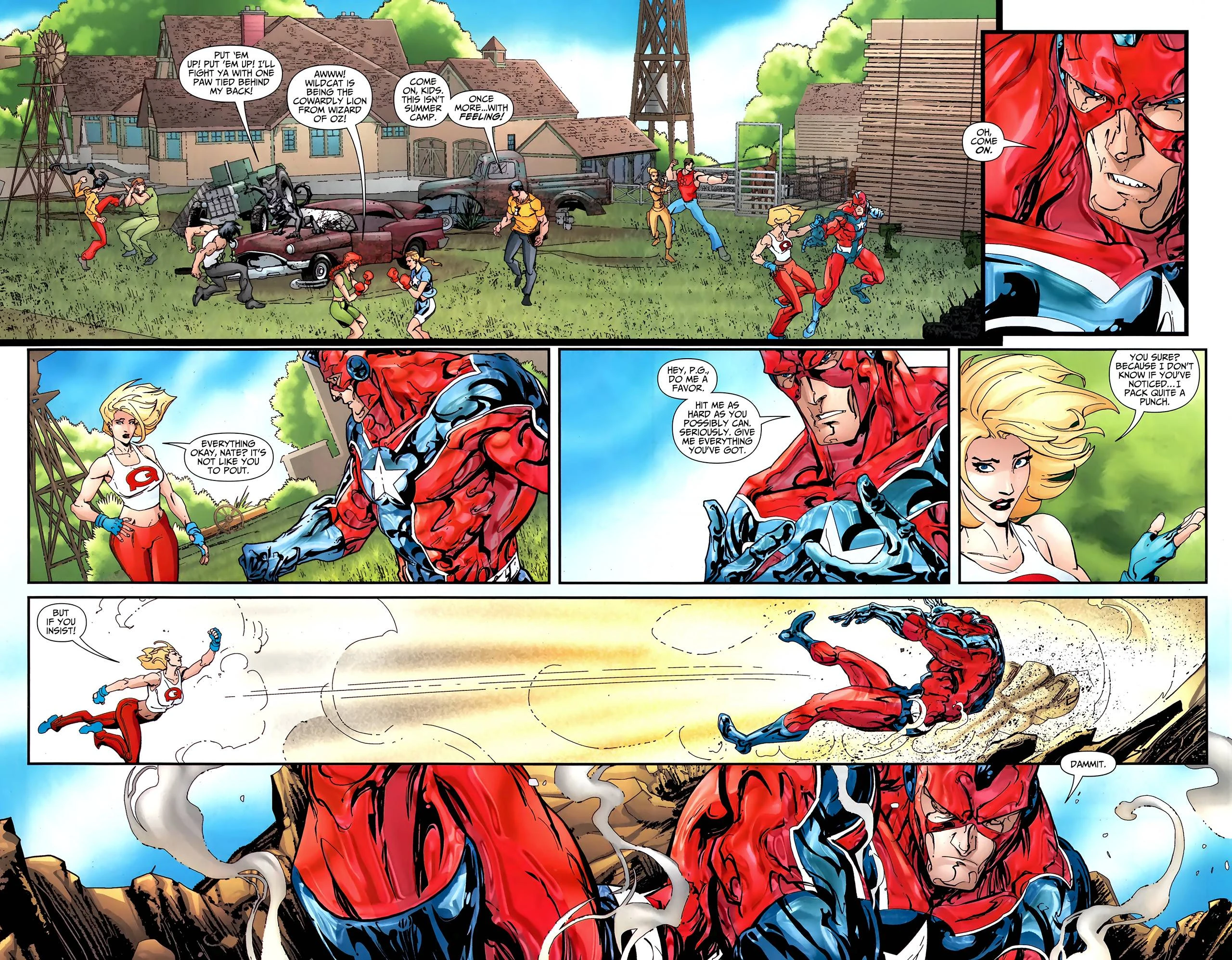 Cap eventually reached downtown, driving up to the scene of destruction. A man, clad in red white and blue steel, Commander Steel, was beating up a giant villain. Steel ended the fight by slamming the villain into the ground with a punch, launching the villain down and creating a massive crater. The villain, in an act of desperation, teleported away from Steel at the last second, causing Steel to hit the ground by himself. This resulted in a massive amount of dust being kicked up, obscuring everyone, including Cap's view.