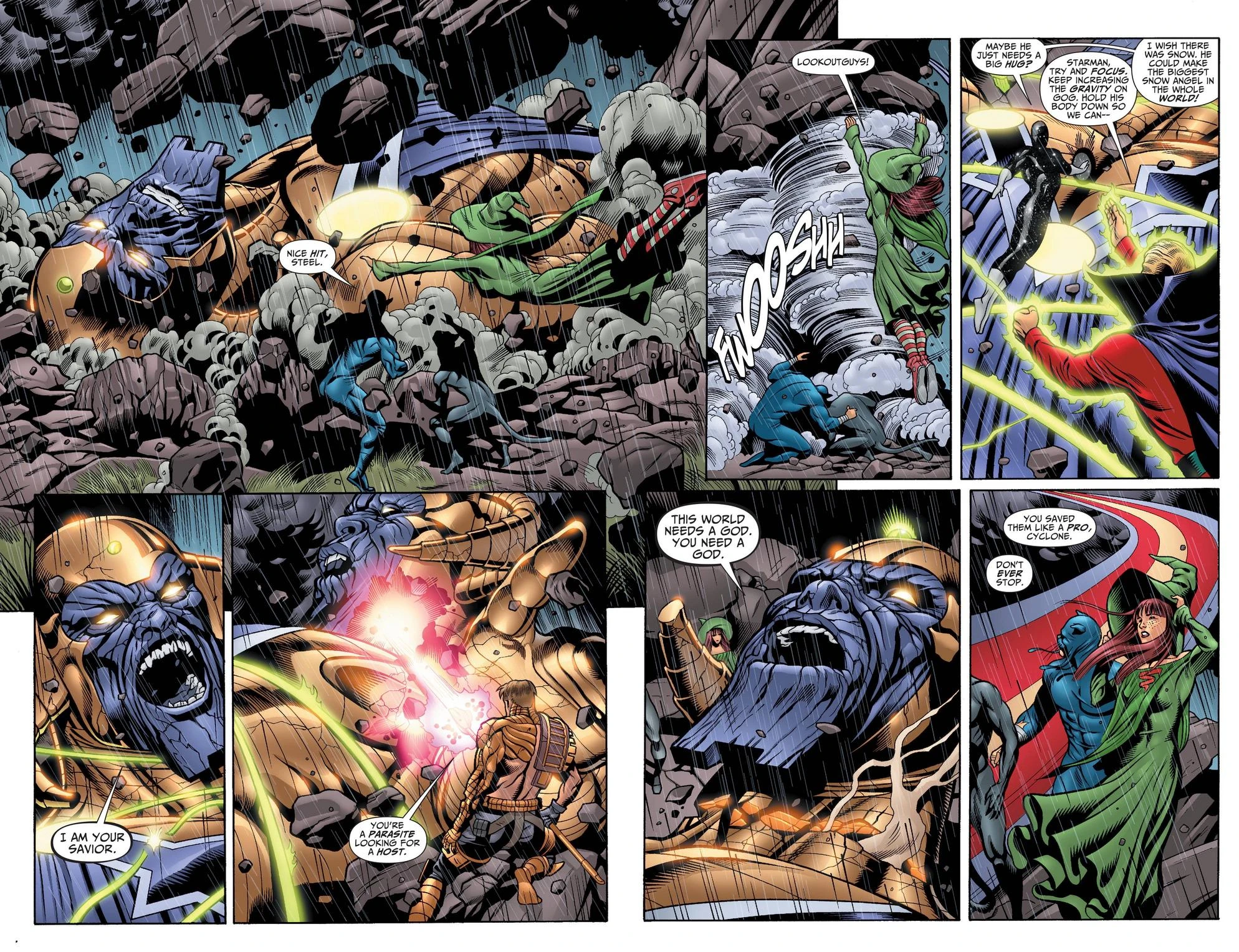 All of a sudden, the pile of debris began to shake and rumble, before Steel burst out of the pile, the top of his costume destroyed.