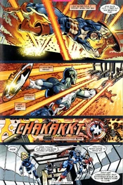 Steel throws out the first attack, hoping to end this quickly, by rushing Cap with a punch. However the second Steel's fist hits Cap's shield, Steel is blown back by a wave of kinetic energy.