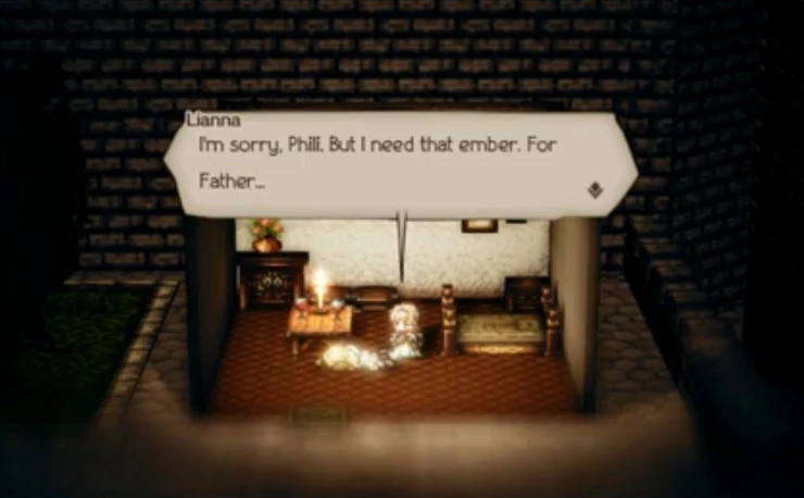Puppy: Lianna revealed that their father was dead, and that she saw the Sacred Flame as a possible way of bringing Josef back. She drugged Ophilia and stole the Lanthorn.
