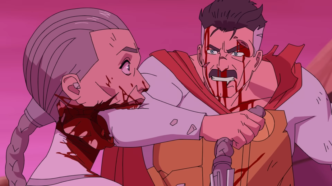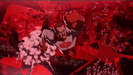 We're shown a clip from Invincible, when Omni-Man flies into a Flaxan interdimensional portal, before cutting to him destroying the Flaxan civilisation's infrastructure. The clip's playback speed should be edited at certain points to accommodate for Crimson's narration.
