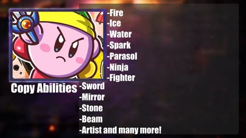 Wiz: Wheel Kirby can run over foes and travel across Continents in a matter of seconds, Fighter Kirby is a master martieux artist and sword Kirby is a master with a blade he can upgrade the Sword into the Massive Ultra Sword capable of killing massive foes