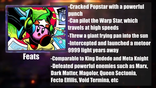 Wiz: Kirby has also defeated King Dedede and cracked the Planet Popstar in half while in normal form and survived being crushed under several hundred tonnes and only being phased and once survived a Planet-sized explosion without a scratch