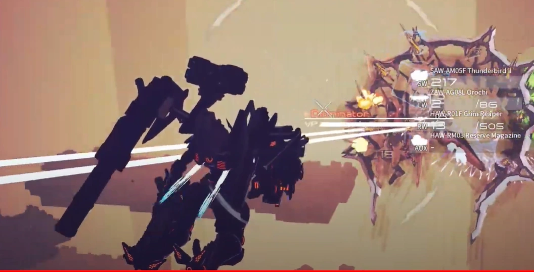 EXCELSUS has access to twin plasma cannons on it's head, two retractable blades near the front, and a load of missiles, making it highly effective for a one on one fight.