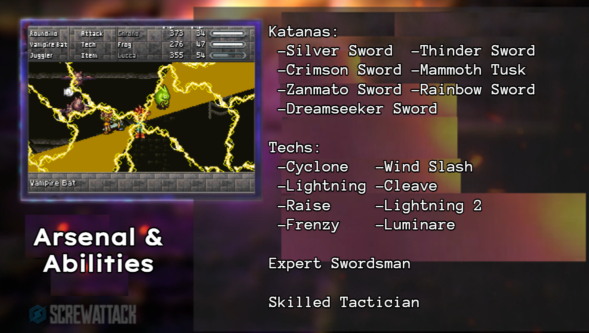 Wiz: Crono utilizes magic and certain combat abilities, or Techs, which stem from his natural elemental powers of lightning and light and battle prowess.