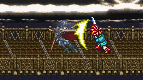 Lucina presses her advantage and spins the lance in hand again, activating the Sol technique and slashing Crono with Geirskögul, simultaneously injuring him again while magically rejuvenating herself.