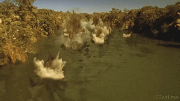 The piranha slapping the shark with it's huge tail than grabbing it's head and throwing it through the water and slamming into it ripping up the sharks flesh