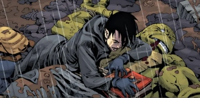 The powerful force of the shockwave had shattered the Adamantium in Logan’s arm and left him with only his protruding finger bones left to use as claws. He plummets to the ground along with the smoke bombs, scattering dust, smoke and blood across the mud.