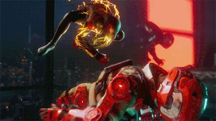 Noir leaps up to the ceiling to propel himself forward for a ground pound. Gwen squints her eyes and cartwheels into a flip causing the attack to miss. The floor cracks from Noir's attack.