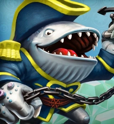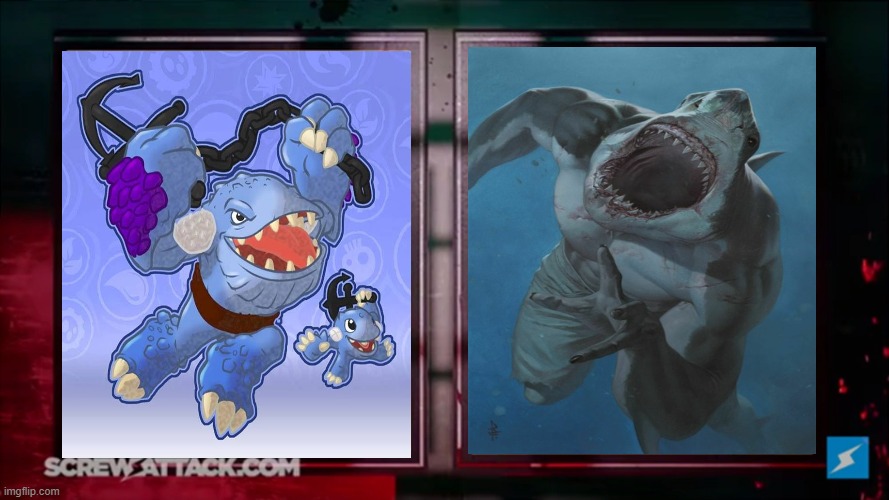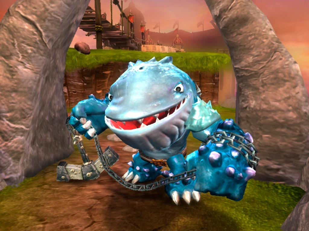 King shark lunges at the Skylander mouth open, but Thumpback dodges the attack, making him chomp on a random boat, biting it in half. King shark then picks up the two halves up of the boat and throws them at Thumpback. The Skylander swings his anchor chain around before throwing it at the nearby projectiles, smashing through the boat pieces, and slamming into King shark, knocking him back into the water. Thumpback looks around the water waiting for King Shark to attack from the water. But King Shark appears from behind him, but Thumpback turns around just in time to use his anchor as a shield to block the mutant's sharks teeth.